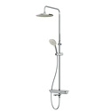 Устройство: душевая система • Смеситель: термостатический • Ручная лейка: размер 120 мм, настройки 3 шт • Верхний душ: размер 250 мм, настройки 1 шт • Комплектация: ручной душ, смеситель, стойка, шланг, крепление ручного душа, полка