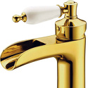 Назначение: для умывальника • Конструкция: однорычажный • Монтаж: горизонтальный • Материал: покрытие - золото • Монтажные отверстия: 1 отверстие • Форма излива: каскадная • Душевая лейка в комплекте: нет • Донный клапан в комплекте: есть