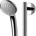 Устройство: душевой набор • Ручная лейка: размер 80 мм, настройки 3 шт • Комплектация: лейка, стойка, шланг, крепление лейки, мыльница