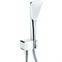 душевая лейка KLUDI FIZZ 1S DN 15 бодрящая струя система быстрой очистки от известковых отложений расход воды 19 л/мин при давлении 3 бара шланг KLUDI SUPARAFLEX SILVER/WHITE с двусторонней защитой от скручивания G 1/2 x G 1/2 x 1250 мм соединение для шланга с настенным держателем для душа DN 15 клапан защиты от обратного потока с крепежным набором отвод для душа G 1/2 с коническими гайками
